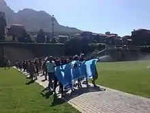 As an immediate response, students at the University of Witwatersrand mobilised to shut down their campus, blockading entrances.[63] The protesters claimed that all protest would be peaceful; however, they turned to violence when vehemently denied entrance to the Great Hall by heavily armed riot police. Concrete objects were destroyed and pieces were thrown at security guards who were defending the hall. The students were demanding "free decolonized education for black people".[64] This was purportedly followed by students at University of the Free State and University of Pretoria.[65][66][67]