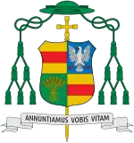 Upon being made a bishop, Genn took up an episcopal coat of arms. Upon being made Bishop of Münster, he adopted a new coat of arms. On his current coat of arms, the yellow and red striped fields on the top left and bottom right of the shield are taken from the Diocese of Münster's coat of arms. The eagle in the top right field is indicative of Genn's hometown of Wassenach, as an eagle is present in its coat of arms, and is a remnant of his previous coats of arms as Bishop of Essen and Auxiliary Bishop of Trier. Moreover, the eagle relates to his Latin episcopal motto, Annuntiamus vobis vitam, which is taken from 1 John 1, 1–4.[7]