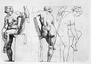 Avery suggests a now lost ancient Roman figure of a Bathing Venus as a possible source, one he identifies in a drawing showing three points of view, made by Maarten van Heemskerck during a visit to Rome around 1535. In this lost work, the figure stands on her right leg, and is largely supported by her left buttock which rests on a pedestal. Similar to Giambologna's figure, this woman also bends forward to clean her left leg.[12] Other sources might have been Raphael‘s Psyche being carried by Cupid (1517-18, Rome, Villa Farnesina) and Michelangelo's Ignudi (Rome, Vatican, Sixtine Chapel, 1508-12).[13] A red wax model attributed to Giambologna (private collection), which is missing its limbs and head, and slumps backwards, is close in pose to the Getty-statue, especially in the left shoulder and angle of the neck.[14]