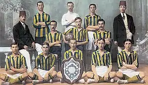 Fenerbahçe were founded in 1907 in Kadıköy, Istanbul, by local men Ziya Songülen, Ayetullah Bey and Necip Okaner. This group founded the club secretly in order to keep a low profile and not get into any trouble with the strict Ottoman rule, so strict that the Sultan Abdul Hamid II forbade the Turkish youth to set up a club or engage in the game of football played by the English families that was watched in envy. The three men came together and concluded that Kadıköy was in desperate need of its own football club, where locals would get a chance to practise the game of football. Ziya Songülen was elected the first president of the club, Ayetullah Bey became the first general secretary and Necip Okaner was given the post of general captain.[4] The lighthouse situated on the Fenerbahçe cape was a big influence on the design of the club's first crest, which sported the yellow and white colors of daffodils around the lighthouse. The kits were also designed with yellow and white stripes.[4] The crest of the club was changed in 1910 when Hikmet Topuzer redesigned the badge after Ziya Songülen had changed the colors to yellow and navy, still seen today. Fenerbahçe's activities were kept in secrecy until a legislation reform in 1908, when, under a new law, all football clubs had to register to exist legally.[4]
