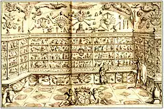 A picture of the "Cabinet of Curiosities" has been preserved. It includes truly natural specimens as well as some man-made specimens of fictitious animals such as a winged fish and a Hippocampus, half horse and half fish. In the picture, the bust of Dante Alighieri forms the centerpiece of the collection. Below and to its right is the dwarf Sebastiano Biavati, a living member of his collection, and Cospi himself stands to the right.[3] The collection was combined with a collection made by Ulisse Aldrovandi.[4] In 1743 the Academy of Sciences of Bologna Institute obtained the donation of this collection, the Naturalia Museum.[5]