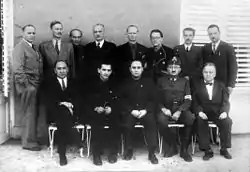 The Hungarian parliament approved the formation of a Council of Regency (Kormányzótanács) of three. On 4 November, Szálasi was sworn as Leader of the Nation (nemzetvezető).[7] He formed a government of sixteen ministers, half of which were members of the Arrow Cross Party. While the Horthy regency had come to an end, the Hungarian monarchy was not abolished by the Szálasi regime, as government newspapers kept referring to the country as the Kingdom of Hungary (Magyar Királyság, also abbreviated as m.kir.), although Magyarország (Hungary) was frequently used as an alternative.[8][9]