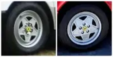 Wheels on all vehicles are of a five-spoke alloy design in a clear-lacquered finish. Two distinct patterns were used: the Mondial 8 and QV models have wheels with a flat centre and pronounced edges to the five spokes, whereas the 3.2 and t models' wheels have a convex centre and smoother, angled spokes. All wheels feature a yellow circular centre cap bearing Ferrari's black Cavallino Rampante rearing-horse logo.[1]:78–89[4]