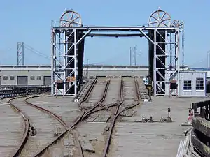 While the apron shown could bear the weight of a locomotive, it could not withstand the traction, so a string of flatcars was used to link the locomotive to a short string of railcars, which were then moved on or off of the barge. If a locomotive was to be moved (a rare event), it would be moved by another locomotive using the same method. The auxiliary track to the left of the headworks was for storage of the flatcar string.