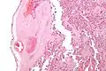 | Intermediate magnification micrograph of the placental disc showing a thrombosed fetal vein, as may be seen in fetal thrombotic vasculopathy. H&E stain. | |