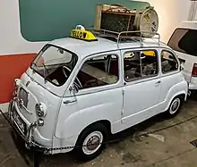 - Taxi version, introduced at the April 1956 Turin Motor Show.[16] It featured an individual driver seat, passenger seat which could be folded down becoming a luggage shelf, two foldaway jump seats in the middle, and a bench seat at the rear against the firewall. Original price on the Italian market: 835,000 Lire.[15] Until the 1970s, the Multipla was widely used as a taxi in many parts of Italy.
