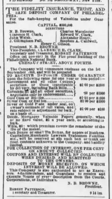 It was founded in 1866 by financier Clarence H. Clark (1833–1906) and several partners as the Fidelity Insurance, Trust, & Safe Deposit Company with initial capital of $250,000. Besides selling insurance and transacting trust business, the company was the second U.S. bank to offer safe deposit services.[1] The bank was located at Broad and Walnut Streets in Philadelphia.[2]