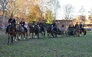 The Field Artillery Regiment "a Cavallo" (Italian: Reggimento Artiglieria Terrestre "a Cavallo") is a field artillery regiment of the Italian Army. The regiment is the heir to all Italian Army horse artillery units and maintains a mounted section with historic horse-drawn field guns. Today the regiment is based in Vercelli in Piedmont and Milan in Lombardy. The regiment is operationally assigned to the Cavalry Brigade "Pozzuolo del Friuli" and provides artillery support to the Italian Armed Forces' National Sea Projection Capability.[3]
