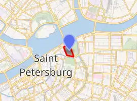 The square covers an area of nearly 9 hectares (22 acres).[1] Bordering the Field of Mars to the north are the Marble Palace, Suvorov Square, the Betskoy and the Saltykov Mansions, separated from the square by Millionnaya Street. To the west are the former barracks of the Pavlovsky Regiment. The Moyka River forms the boundary to the south, across from which is the Mikhailovsky Palace and Garden. The east side is bounded by the Swan Canal, which separates the Field of Mars from the Summer Garden.[2]