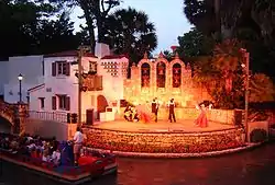 Fiesta Noche del Rio is a seasonal outdoor performance which features the songs and dances of Mexico, Spain, Argentina, and the U.S. states of California and Texas.