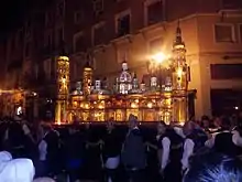 The Glass Rosary parade, or Rosario de Cristal, is one of the most unusual parades in the world. Originating in 1889, it combines both religiosity and art and consists of 29 parade floats made entirely of glass, known as "faroles" (lamps), all illuminated from within, making for a spectacular evening parade and light show. Fifteen of the floats represent the mysteries of the rosary, while other floats depict different topics, such as recreations of famous sanctuaries like the Basilica del Pilar, or the Sagrada Familia, as well as other religious and cultural themes.