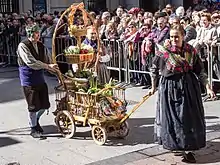 On the morning of 13 October, the Offering of Fruits takes place. This tradition, akin to a harvest festival, first took place in 1949, and was a precursor to the offering of Flowers. A parade takes place with a similar route to that of the Offering of Flowers, in which people bring to the Virgin a variety of fruits, primarily produce from the region of Aragon, as well as other regions in the country.
