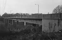 The second Fifth Street Viaduct was a reinforced concrete bridge built in 1933 to allow for automobile, streetcar, and pedestrian travel between the neighborhoods of Highland Park and Jackson Ward. The design was drafted by Alfredo C. Janni and the bridge was built by the Richmond Bridge Corporation.[1]:p.13 The 1,185-foot (360 m) bridge consisted of seven double-span rigid frames supported on expansion piers and stiff towers[1]:p.1, 2 and was one of five Richmond bridges built during 1933-34 in a major public works program sponsored by the Richmond Bridge Corporation in conjunction with local authorities[1]:p.2
