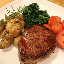 Filet mignon (/ˌfiːleɪ ˈmiːnjɒ̃/;[1] French: [filɛ miɲɔ̃]; lit. '"tender, delicate, or fine fillet"') is a cut of meat taken from the smaller end of the tenderloin, or psoas major of an animal carcass. In French it can refer to the tenderloin of several animals but is mostly used to refer to cuts of pork tenderloin.[2]