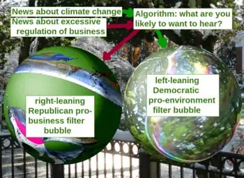 A filter bubble – a term coined by Internet activist Eli Pariser – is a state of intellectual isolation[1] that can result from personalized searches when a website algorithm selectively guesses what information a user would like to see based on information about the user, such as location, past click-behavior and search history.[2][3][4] As a result, users become separated from information that disagrees with their viewpoints, effectively isolating them in their own cultural or ideological bubbles.[5] The choices made by these algorithms are not transparent.[6] Prime examples include Google Personalized Search results and Facebook's personalized news-stream. The bubble effect may have negative implications for civic discourse, according to Pariser, but contrasting views regard the effect as minimal[7] and addressable.[8] The results of the U.S. presidential election in 2016 have been associated with the influence of social media platforms such as Twitter and Facebook,[9][10] and as a result have called into question the effects of the "filter bubble" phenomenon on user exposure to fake news and echo chambers,[11] spurring new interest in the term,[12] with many concerned that the phenomenon may harm democracy and well-being by making the effects of misinformation worse.[13][14][12][15][16][17]