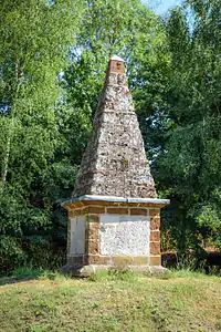 The obelisk is located in a small enclosure next to the A6 and A510 roundabout.