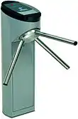 An example of a simple mechanism that can be modeled by a state machine is a turnstile.[4][5] A turnstile, used to control access to subways and amusement park rides, is a gate with three rotating arms at waist height, one across the entryway. Initially the arms are locked, blocking the entry, preventing patrons from passing through. Depositing a coin or token in a slot on the turnstile unlocks the arms, allowing a single customer to push through. After the customer passes through, the arms are locked again until another coin is inserted.