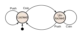 Considered as a state machine, the turnstile has two possible states: Locked and Unlocked.[4] There are two possible inputs that affect its state: putting a coin in the slot (coin) and pushing the arm (push). In the locked state, pushing on the arm has no effect; no matter how many times the input push is given, it stays in the locked state. Putting a coin in – that is, giving the machine a coin input – shifts the state from Locked to Unlocked. In the unlocked state, putting additional coins in has no effect; that is, giving additional coin inputs does not change the state. However, a customer pushing through the arms, giving a push input, shifts the state back to Locked.