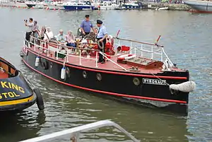 Pyronaut was sold to the Port of Bristol Authority, who took her to Avonmouth and began work on converting her into a divers' boat. This entailed removing all the fire-fighting pumps and moving her engines forward in the hull to create space for a changing room. The work was never completed, and she was sold again to a private owner in 1983, who began to fit out the changing room as a saloon, with the intention of using Pyronaut as a working/living craft in the south of Ireland. Shortly before completing the work in 1989, he decided to sell the vessel to Bristol City Museum and Art Gallery, based at the now-closed Bristol Industrial Museum where restoration and preservation was completed in 1995.[3] Pyronaut can now be seen outside the new M Shed museum,[4] berthed with the museum‘s tugs Mayflower and John King. Listed as part of the National Historic Fleet,[5] she performs displays during major harbour events as well as operating for trips on some summer weekends.[6][7] In June 2012 she travelled to London by road to take part in the Queen's Diamond Jubilee Pageant.