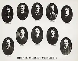 The First Hughes Ministry (Labor) was the 12th ministry of the Government of Australia. It was led by the country's 7th Prime Minister, Billy Hughes. The First Hughes Ministry succeeded the Third Fisher Ministry, which dissolved on 27 October 1915 following Andrew Fisher's retirement from Parliament to become the next High Commissioner to the United Kingdom. The ministry was replaced by the Second Hughes Ministry on 14 November 1916 following the split that took place within Labor over the issue of conscription. This led to Hughes and his supporters leaving the party to form the National Labor Party.[1]