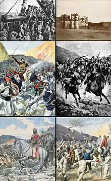 ![]() Clockwise from top left: Italian soldiers en route to Massawa; castle of Yohannes IV at Mek'ele;[1] Ethiopian cavalry at the Battle of Adwa; Italian prisoners are freed following the end of hostilities; Menelik II at Adwa; Ras Makonnen leading Ethiopian troops in the Battle of Amba Alagi | |||||||||
