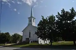 The main entrances provide access to vestibule areas, which are separated from the sanctuary by doors. The eastern vestibule has a hatch in the floor which provides access to the basement (which is otherwise only accessible from an outside doorway on the southeast side). The sanctuary is roughly square, with rows of bench pews divided by three aisles. At the northwest side of the sanctuary is a raised platform with a podium, settee, and chairs. Illumination is provided to the space by kerosene-fueled wall sconce fixtures, and by two ornate brass chandeliers with kerosene lamps covered by frosted globes. Heat is provided by a pair of wood stoves on the north side of the room.[2]