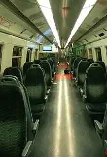 A First Class compartment is available on each train serving the East Rail line (formerly KCR East Rail) in Hong Kong. Instead of longitudinal, stainless steel benches offered to standard-class passengers, the first-class compartments have comfier, individual padded seating with armrests. They are arranged in pairs and oriented transversely to the compartments.[6] Passengers are required to pay an extra "first class premium" (equaling to the standard adult fare of the same East Rail line journey) on top of the standard fare, and first-class compartments are regularly patrolled by ticket inspectors.[7]