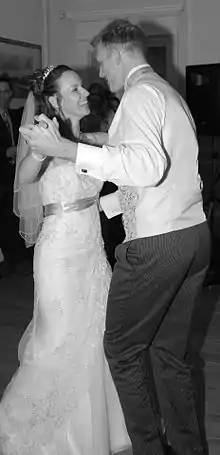 In the current times, ballroom dance is not a skill that is common within society. Therefore, some modern couples either slow dance or learn a dance, whether it be a ballroom dance style or a choreographed dance routine. The music to which they dance is also highly varied, with modern chart hits often being selected.[5] Teaching and rehearsing the "first dance" is now a service offered by dance studios, independent dance instructors and specialist wedding dance tuition companies.[6][7][8][9]