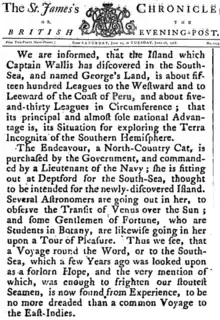On 16 February 1768 the Royal Society petitioned King George III to finance a scientific expedition to the Pacific to study and observe the 1769 transit of Venus across the sun to enable the measurement of the distance from the Earth to the Sun.[2] Royal approval was granted for the expedition, and the Admiralty elected to combine the scientific voyage with a confidential mission to search the south Pacific for signs of the postulated continent Terra Australis Incognita (or "unknown southern land").[3] The aims of the expedition were revealed in the press: "To-morrow morning Mr. Banks, Dr. Solano [sic], with Mr. Green, the Astronomer, will set out for Deal, to embark on board the Endeavour, Capt. Cook, for the South Seas, under the direction of the Royal Society, to observe the Transit of Venus next summer, and to make discoveries to the South and West of Cape Horn".[4] The London Gazetteer was more explicit when it reported on 18 August 1768: "The gentlemen, who are to sail in a few days for George's Land, the new discovered island in the Pacific ocean, with an intention to observe the Transit of Venus, are likewise, we are credibly informed, to attempt some new discoveries in that vast unknown tract, above the latitude 40".[5] Another article reported that "the principal and almost sole national advantage" of the island discovered by Captain Wallace, that is Tahiti, was "its situation for exploring the Terra Incognita of the Southern Hemisphere", and that, "The Endeavour, a North-Country Cat, is purchased by the Government, and commanded by a Lieutenant of the Navy; she is fitting out at Deptford for the South Sea, thought to be intended for the newly discovered island."[6] The Gazette de France of 20 June 1768 reported that the British Admiralty was outfitting two sloops of war to go to "the newly discovered island", from whence they would "essay the discovery of the Southern Continent".