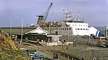 The GWR created a new port by building the 900 m (3,000 ft) North Breakwater by quarrying stone from the headland at Goodwick. The quarried-out area became the new quay and terminus for the West Wales line. On 30 August 1906, Fishguard harbour station was officially opened when the Waterford and Cork ferry services were transferred from Neyland to Fishguard Harbour.[3] Three years later, the first Cunard liner to call at Fishguard was the RMS Mauretania on 30 August 1909.[4] However, passengers had to be transferred ashore and the waiting London train by tender due to the shallowness of the harbour.[5]