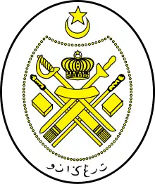 The arms originally consisted of a white outlined oval that encompassed a series of symbols coloured in yellow and a Jawi motto.[2][13] During the rule of Sultan Ismail Nasiruddin Shah (1945–1979), the emblem was modified with the addition of a dotted figure of a seal around all of the symbols except the star and crescent, which resides over the seal, the addition of a pair of maces and the shortening of the motto.[2][13]
