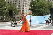 Uyghur woman dancing in front of the flag in Washington D.C.
