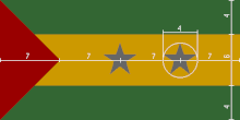 | Design | A horizontal tricolour of green, yellow and green; with a red triangle based at the hoist and two black five-pointed stars in the yellow stripe |