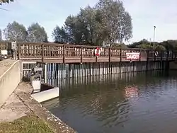 As navigation increased in importance, improvements were made to the basic design, and they came to be known by various names according to where they were located. Thus on the Thames they were called navigation weirs, on the East Anglian rivers they were called staunches, those on the River Avon, Warwickshire were called water gates, and in a number of instances they were called half locks. On the River Nene and some of the tributaries of the River Great Ouse, a design using a guillotine gate in a wooden frame was used from the early seventeenth century onwards. The gate was opened by operating a large spoked wheel, connected by chains to a toothed drum.[5]