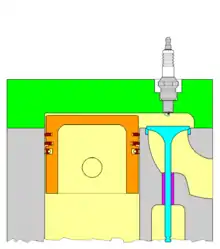 The sidevalve engine's combustion chamber is not above the piston (as in an OHV (overhead valve) engine) but to the side, above the valves. The spark plug may be sited over the piston (as in an OHV engine) or above the valves; but aircraft designs with two plugs per cylinder may use either or both positions.[5]