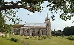 The Grade I listed Church of England parish church, dating from the late 12th century, is dedicated to St Mary Magdalene.[3] The 120 feet (37 m) church tower with spire is detached from the nave by 15 feet (4.6 m). The fabric is mainly Decorated in style, with Early English arcades and a Perpendicular west window. According to Cox (1916), the church was restored in 1860, when the chancel was rebuilt, although the canopied sedilia was retained.[4][5] In 1964 Pevsner noted 1798 repairs and considered the church "over-restored". He dated a chancel rebuild to 1843, questioned if it was "done correctly", and recorded Victorian tracery in the aisle windows, a blocked doorway to a previous chapel in the chancel, "fine busts of great variety", a Decorated-style sedilia and piscina with ogee arches and crocketed gables, a reredos dated 1790, and a defaced 14th-century effigy.[6]