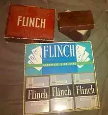 Flinch is a card game that was invented in 1901 by A.J. Patterson. Flinch is a card game that is based on stockpiling. The game is played with a custom deck and was first produced by the Flinch Card Company in Kalamazoo. This custom deck has 150 cards: ten sets of cards numbered from one to fifteen. Some variations use a deck that has 144 cards. Flinch is based on another game called "Spite and Malice".