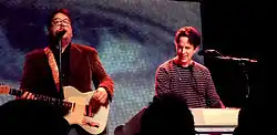The band continued to tour as a duo, with Linnell playing accordion and Flansburgh on guitars, or occasionally playing a marching band bass drum. Large posters of postage stamps adorned the stage as props; the minimal arrangement was received as a boldly simple choice. Sets included a combination of old and new material.[29] As in the past, the band was backed by a tape deck playing drum tracks or a metronome in lieu of a full rhythm section.[30]