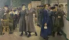 In Bradford Lion painted women working in a munitions factory, but unusually depicted them during a meal break in their works canteen, which were a war-time innovation for Britain.[8] Although several of the women in the painting are clearly tired the overall impression is one of great confidence among the women workers.[9] This contrasts to Lion's portrayal of the male workers.[6]