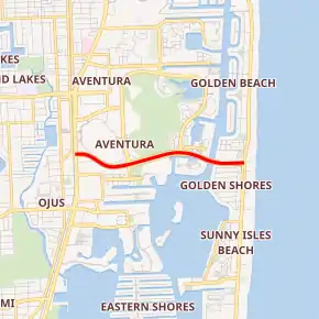 SR 856 begins at US 1 at the southwest corner of Aventura Mall in Aventura, and heads east, lining the southern border of the mall. At the southeast section of the mall, it passes over West Country Club Drive, featuring a Texas U-turn going westbound to eastbound on the frontage road, NE 192nd Street. Following access to and from the frontage roads, SR 856 passes by East Country Club Drive, featuring a Texas U-turn going eastbound to westbound. SR 856 then crosses the Intracoastal Waterway, passing close to high-rise condominiums and other housing. East of the waterway, the road enters Sunny Isles Beach and continues through the high rise and single family residential areas as it quickly hits its eastern terminus of SR A1A.[4]