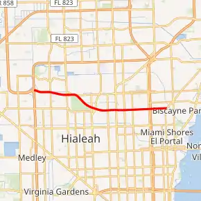 The road begins at the national southern terminus of Interstate 75 at the Palmetto Expressway at the border between Miami Lakes and Hialeah. The road heads east as an eight lane expressway through Hialeah's residential areas and through the first of two $0.47 toll gantries ($0.94 for toll-by-plate users).[3] Following the gantry, the expressway has its first interchange with NW 57th Avenue/Red Road, giving access to Opa-locka Airport just north of the toll road. SR 924 then curves southeast, leaving Hialeah and heading towards the second $.47 toll gantry ($0.94 for toll-by-plate users) in Opa-locka, followed by an interchange with SR 953 before the expressway ends at NW 32nd Avenue, becoming NW 119th Street, a divided surface street heading due east. The road then becomes a mix of commercial and residential areas as it crosses SR 9, then reaching North Miami, intersecting with U.S. Route 441/SR 7, followed by Interstate 95, becoming a residential street before ending at SR 909.[4][5]