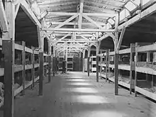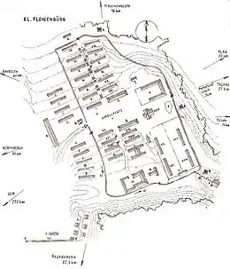 The new prisoners had to construct the camp themselves, beginning with the barbed wire fence; this was initially the main use of forced labor.[9] While performing this heavy and dangerous work, the prisoners lived in makeshift structures. Simultaneously, hundreds of prisoners had to work in the quarries.[23] The camp's population had increased to 1,500 following arrivals from Dachau, Sachsenhausen, and Buchenwald.[5] In January 1939, the first commandant, Jakob Weiseborn, unexpectedly died.[24][25] He was replaced by a former SS officer at Dachau, Karl Künstler, who presided over an era in which the camp became an economically productive center for granite quarrying,[25] and increasingly deadly for its prisoners.[24] With the first barracks complete, in 1939 work began on an internal jail, guard towers, a washing facility, and a sewer system.[9] In April 1939, the economic productivity of the camp led to Pohl ordering the camp to be expanded to fit 3,000 prisoners. To build additional barracks, terraces had to be cut into the hillsides, an arduous task that led to many injuries.[26]