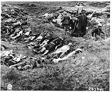 The route proceeded by rail through Neunburg vorm Wald, Weiden in der Oberpfalz, Pfreimd, Nabburg, and Schwarzenfeld, where, on 19[86] or 20 April, about 750 of the Jewish prisoners were stranded after another aerial attack disabled the locomotive. The SS murdered any prisoners who were unable to continue the march on foot. After the liberation, 140 corpses were found in a nearby field; some of the victims had been killed in the air raid, while others had been murdered. One prisoner testified that "The SS men joked and laughed during the shooting... the prisoners were led in groups of 15–20, they had to lie on the ground and were shot in the nape".[87] The survivors were divided into columns 100-strong and marched through heavy rain and mud. Many were ill with fever, but anyone unable to keep up was shot on the spot.[88] At Neukirchen-Balbini, the death march joined up with the larger one of non-Jewish prisoners.[89] Another group of Jewish evacuees continued towards Theresienstadt, arriving in early May.[90]