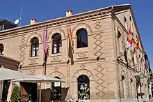 The side façade, which faces calle Miradero del Barrionuevo, has two heights, with eight half-point windows per floor. The voussoir of these arches are highlighted with bricks of different coloration. Both the impost line and the cornice have the same characteristics of the main façade.