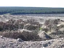 In an effort to restore the damage, the Royal Society for the Protection of Birds (RSPB) have bought a large area in the centre of the Flow Country and have created the Forsinard Flows national nature reserve.[2] More than 20 km2 has been bought back from Fountain Forestry and the young trees felled and allowed to rot in the plough furrow in the hope and expectation that, in 30 to 100 years, the land will revert to peat bog.