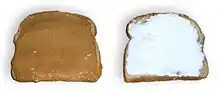 ![]() Showing bread slices with peanut butter and marshmallow creme prior to their being combined into a Fluffernutter sandwich. | |