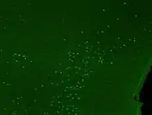 Fluoro-Jade stain is a fluorochrome derived from fluorescein, and is commonly used in neuroscience disciplines to label degenerating neurons in ex vivo tissue of the central nervous system. The first fluoro-jade derivative was reported by Larry Schmued in 1997 as an alternative method from traditional methods for labeling degenerating neurons such as silver nitrate staining, H&E stain, or Nissl stain.[1] Fluoro-Jade may be preferred to other degenerative stains due to simplicity of staining procedures and visual interpretation, which are common drawbacks of conventional degenerative stains. However, the mechanism by which fluoro-jade labels degenerating neurons is unknown thus creating some controversy to the actual physiological condition of the labeled cells.