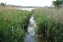 Prior to human development, Flushing Meadows was originally a tidal marsh, with Flushing Creek receiving south-flowing waters from the tides of Flushing Bay.[10][56] The northernmost portion of the river, near its mouth, is still a saltwater wetland area. The wetlands consist of invasive phragmites, a genus of wild grasses, as well as cordgrass. However, the addition of fill on the riverfront has raised the wetland habitat to about the same elevation as the upland habitats, thus endangering wetland plant species that cannot grow at such elevations.[57] North of the LIRR embankment, the left-bank wetland on the Flushing River contains plants such as common reed, field horsetail, chicory, common plantain, and native marsh elder and cordgrass.[58] The birds observed on the northern portion of the river include both waterfowl and wading egrets.[59]