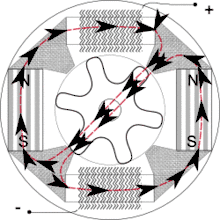In the simplest case, the stator has four poles and the field coils and armature windings are arranged alternately around the stator between the poles. The field magnets are arranged with their poles opposing each other, i.e. one armature is between the two North poles, one between the two South. The rotor is a simple toothed disc of magnetic, but unmagnetized, iron. As it rotates between poles, it links the flux between a single pair of opposing poles. The magnetic circuit of the stator is thus a pair of triangles, each containing a field, an armature and a shared path through the rotor. Flux passes in each circuit from one field and through one armature. As the rotor turns, the other triangular path is formed, switching the flux from one pair of field and armature to the other and also reversing the direction of the flux in the armature coil. It is this reversal of flux that produces the alternating emf.[6]