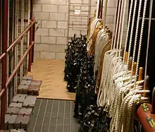 A large counterweight arbor with multiple stacks.